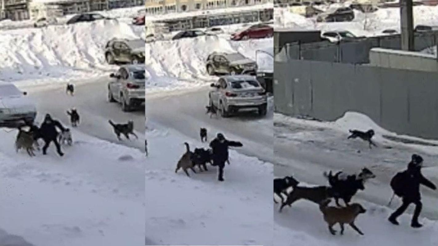 Una jauría de perros callejeros atacó a un niño en Rusia, la tragedia se evitó porque conserje ahuyento a los animales a tiempo.