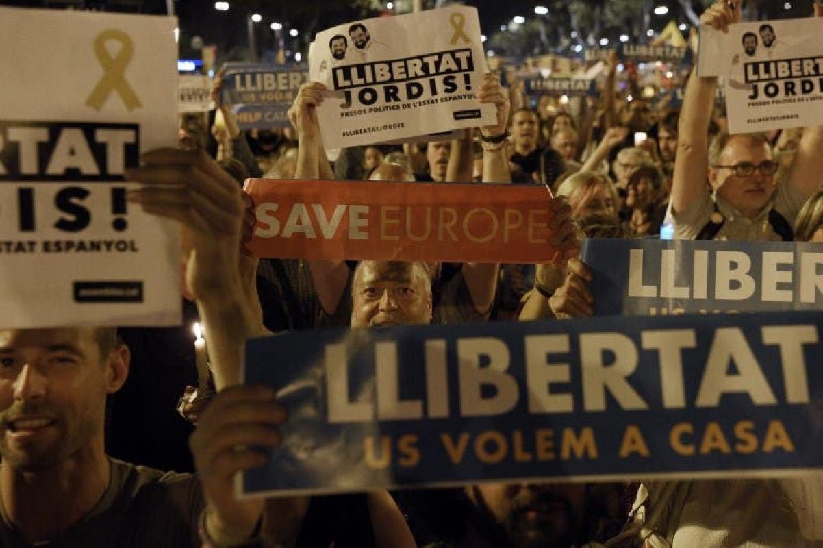Al grito de "independencia", la multitud marchó por el centro de la ciudad en reclamo de la liberación de Jordi Cuixart y Jordi Sánchez, de las organizaciones Òmnium Cultural y Asamblea Nacional Catalana y encarcelados bajo cargos de sedición.