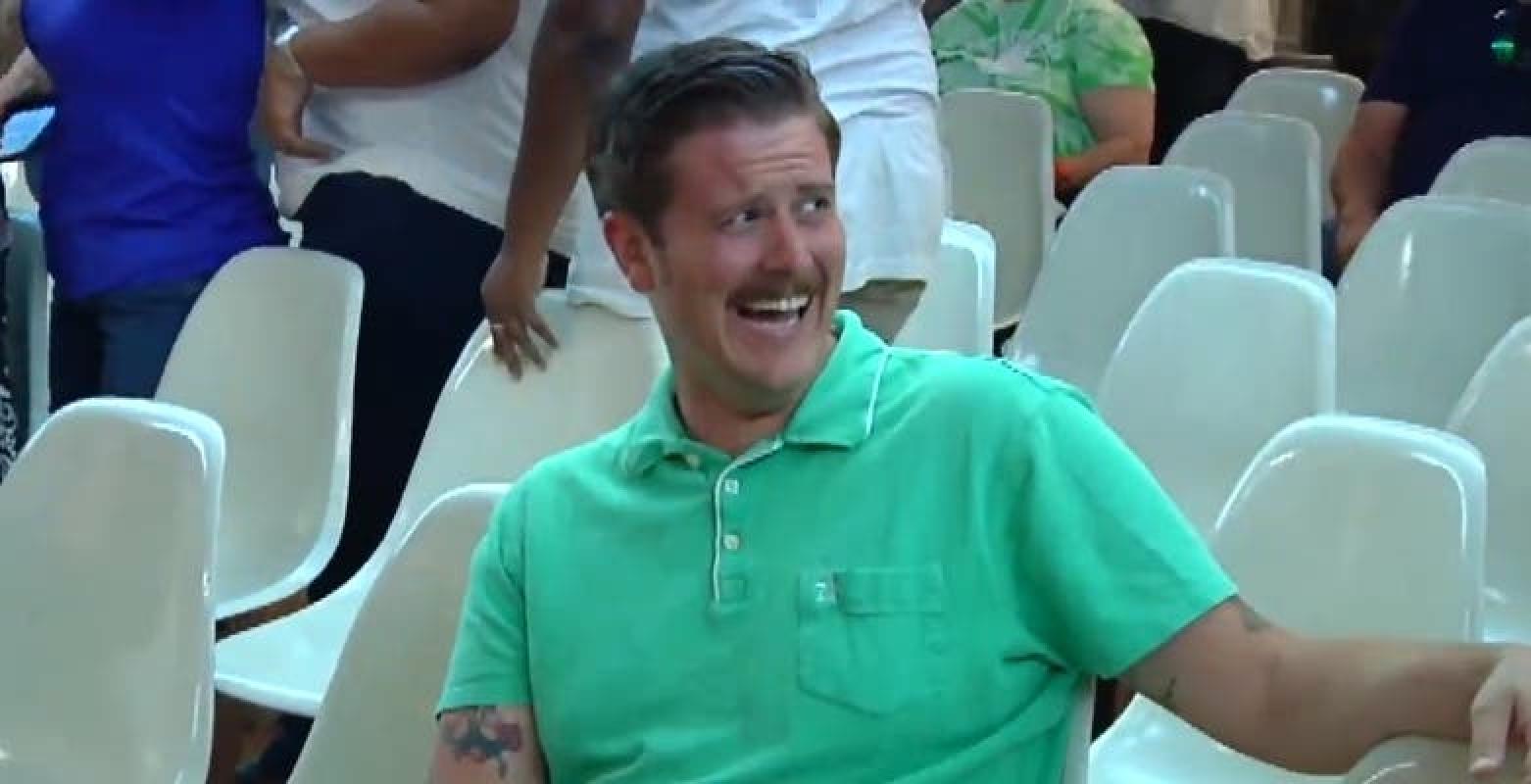 Todos los demás presentes empezaron a abuchearlos, sin embargo, el comediante estadounidense Alex Kack, presente en la junta y sentado al lado de los protestantes, estalló en una risa potente y contagiosa que por casualidad quedó grabada.