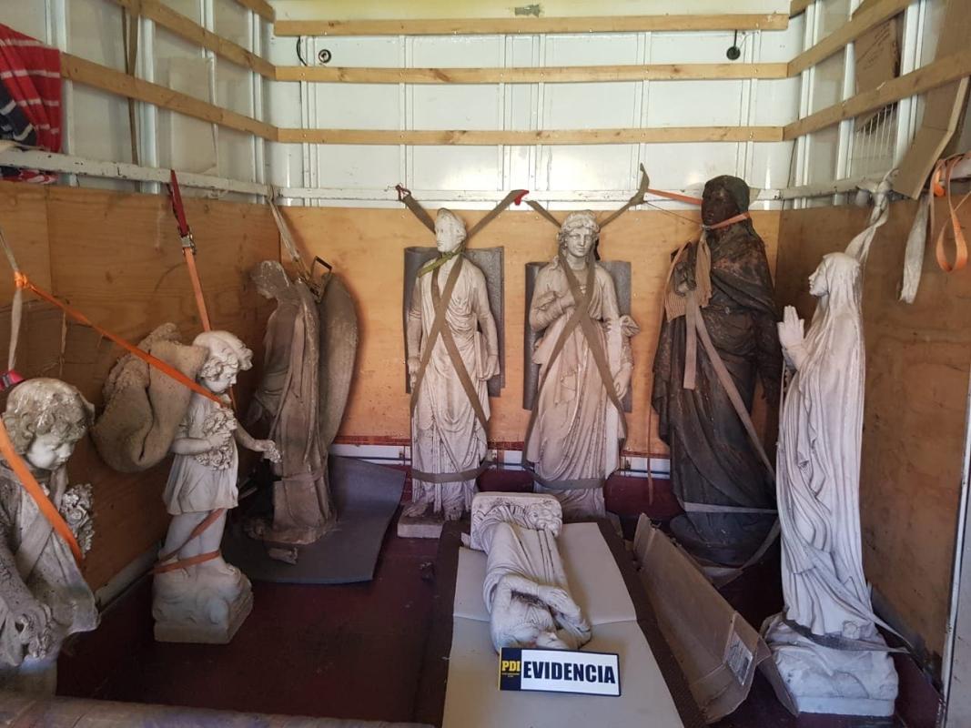 Dos palines mapuches, un tótem mapuche, 9 tejidos precolombinos, 18 piezas de cerámica precolombina y 10 estatuas fueron parte del salto de la incautación realizada esta tarde en la propiedad ubicada en San Francisco de Mostazal. De estas últimas, 8 habían sido sustraídas del Cementerio general, 1 de Quillota y 1 del Cementerio Católico, detallan desde la Fiscalía a T13.