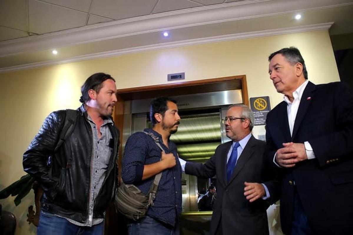 Rodrigo Pérez y Gonzalo Barahona, profesionales de TVN, llegaron al país durante la madrugada de este jueves y el encuentro con el secretario de Estado se llevó a cabo en el Salón de Protocolo del Aeropuerto de Santiago.