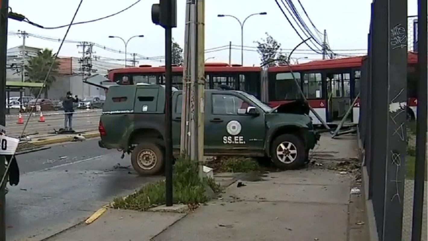 La mañana de este lunes, un violento choque se produjo entre un bus del transporte público y un carro de Gendarmería en el sector de Santa Rosa con Carlos Valdovinos, en la comuna de San Miguel, región Metropolitana.