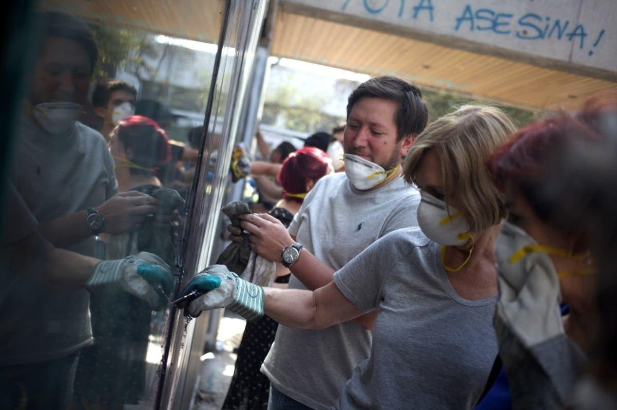 Este domingo, la alcaldesa de la comuna de Providencia, Evelyn Matthei, encabezó la jornada de limpieza del Café Literario, inmueble que se ha visto afectado y rayado durante las manifestaciones del estallido social.