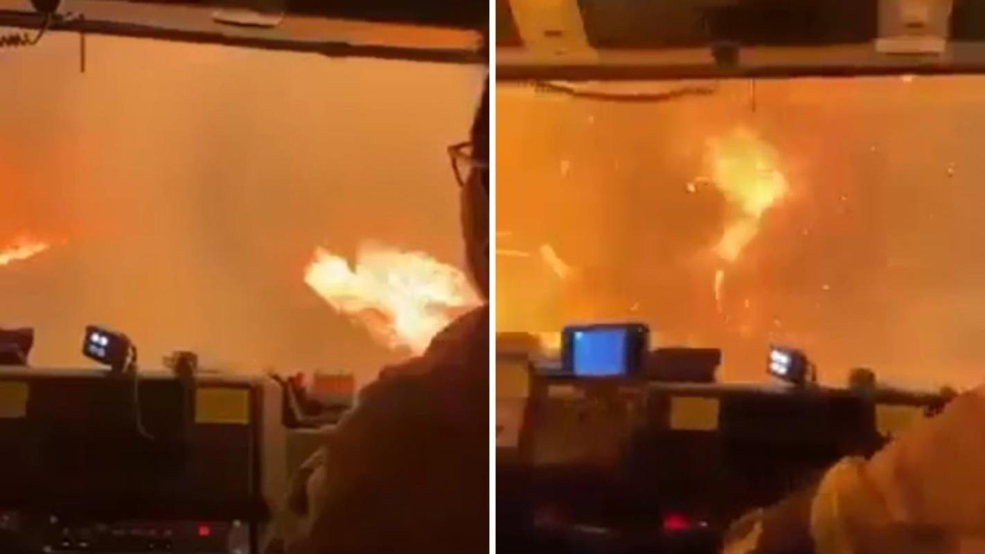 El video muestra a bomberos de Coelemu, en la región de Ñuble, cruzando las llamas de uno de los siniestros a través de sus carros.