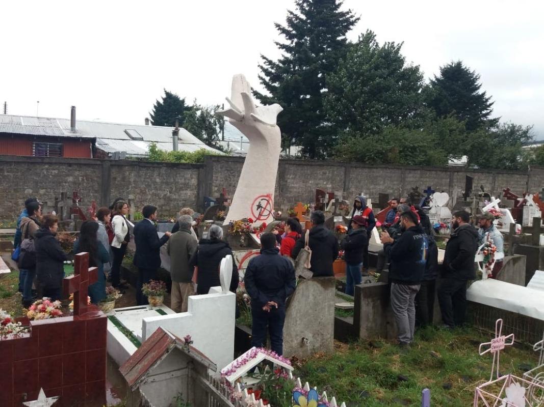 Desconocidos se acercaron hasta el Cementerio de Valdivia de la calle Ramón Picarte, donde está una escultura de una mano que sostiene una paloma blanca sobre su palma, para escribir y dibujar mensajes inentendibles y un signo que se intentaba parecer al escudo del Partido Comunista, tarjado.