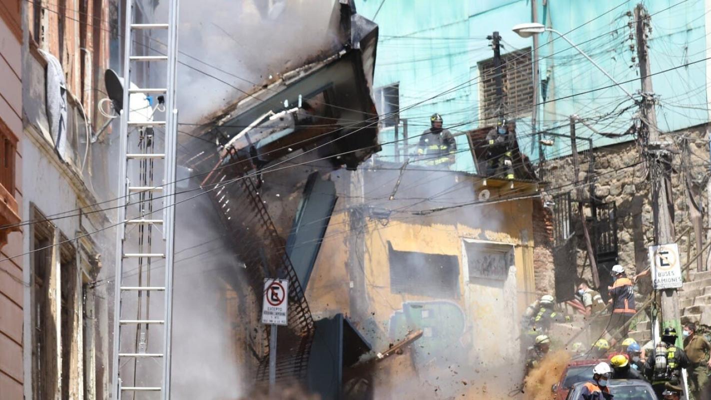 Este lunes, un grupo de voluntarios de Bomberos de Chile salvó por poco de sufrir graves consecuencias a raíz del derrumbe de parte de la fachada de un inmueble en Valparaíso, en medio de un incendio.