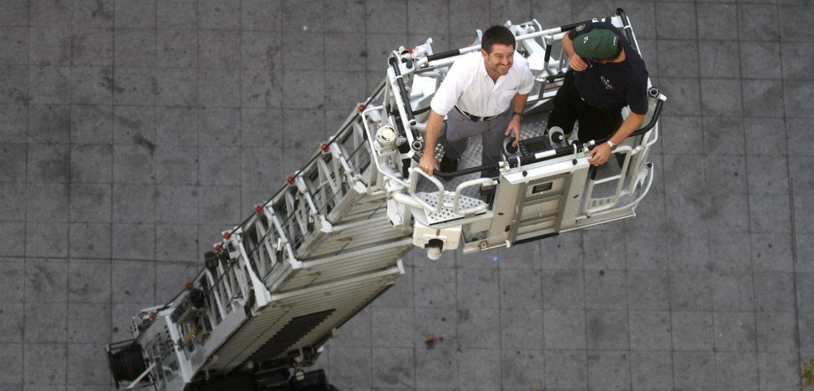 Esta jornada el intendente metropolitano, Claudio Orrego, asistió a la demostracion de las características y técnicas de la nueva escala telescópica adquirida por Bomberos de Santiago.