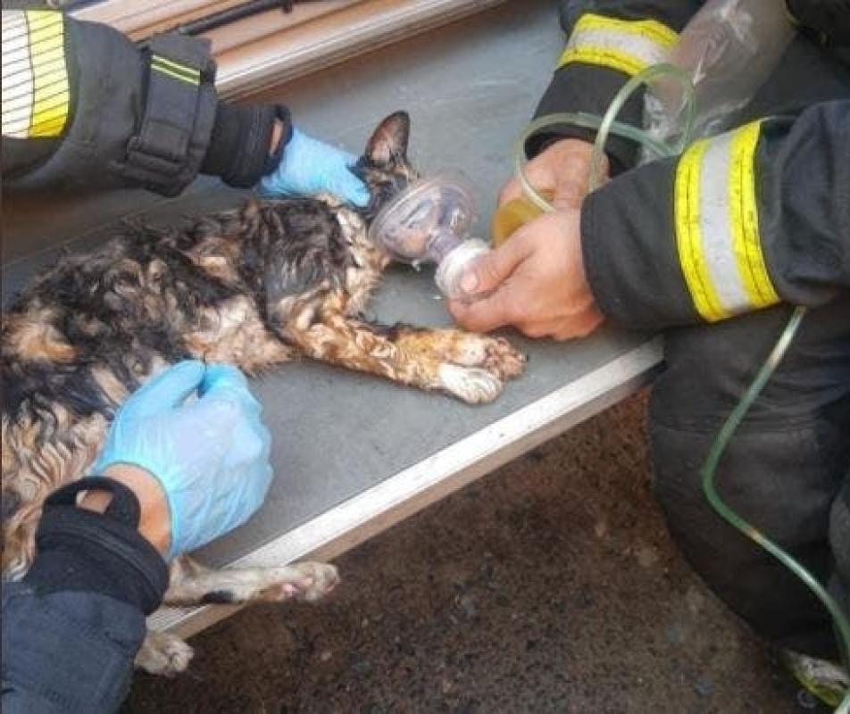 Los miembros de la compañía le administraron oxígeno al animal, quien estaba inconsciente tras inhalar mucho humo.