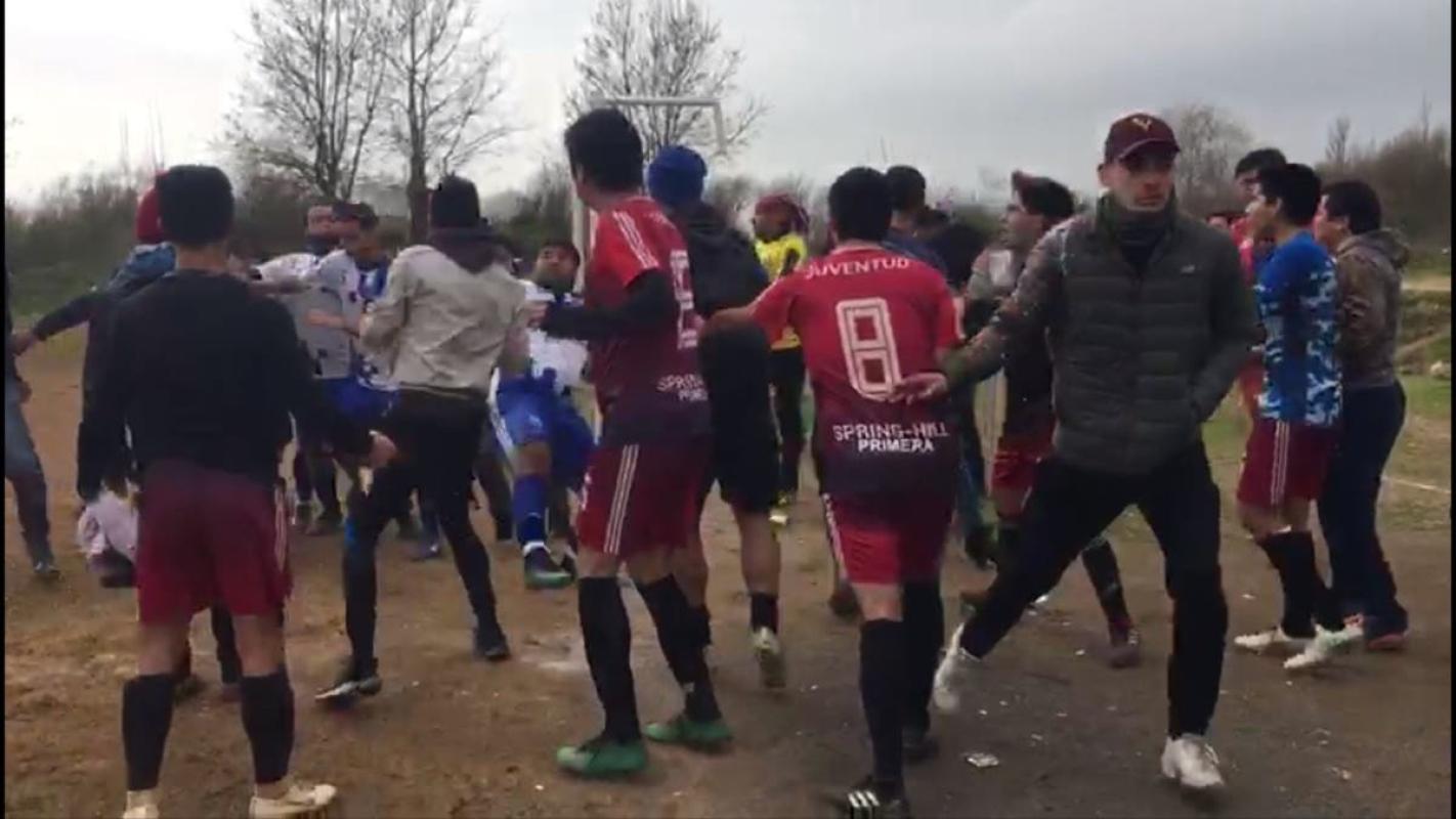 Lanzando puñetazos y patadas, al menos 40 personas participaron en una pelea masiva este lunes en medio de un partido de fútbol amateur en San Pedro de la Paz, provincia de Concepción.