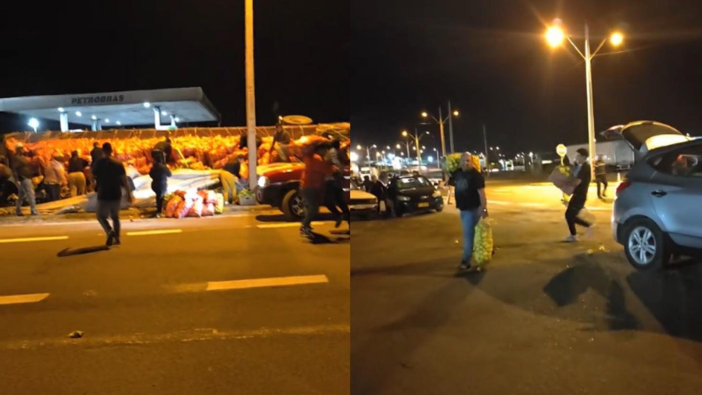 Personas que se encontraban en el lugar comenzaron a robar los sacos con frutas y verduras que transportaba el camión, incluso frente a personal de Carabineros que estaban en la zona.