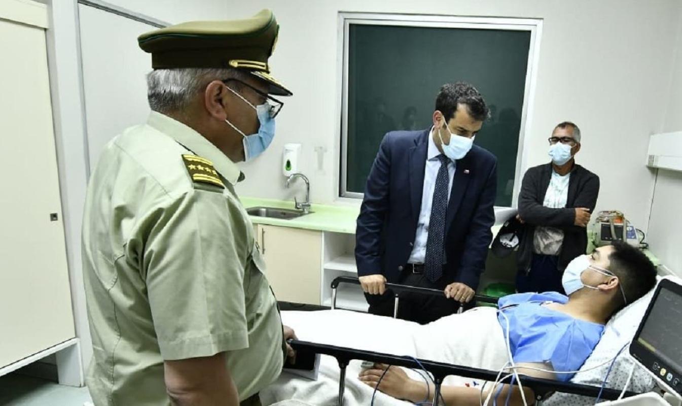 El ministro del Interior, Rodrigo Delgado, junto al subsecretario del Interior, Juan Francisco Galli, la subsecretaría de Prevención del Delito, María José Gómez y el general director de Carabineros de Chile, Ricardo Yáñez, visitaron en el Hospital de Carabineros, a los funcionarios policiales heridos durante las manifestaciones del lunes, jornada donde se conmemoró el 18-O.