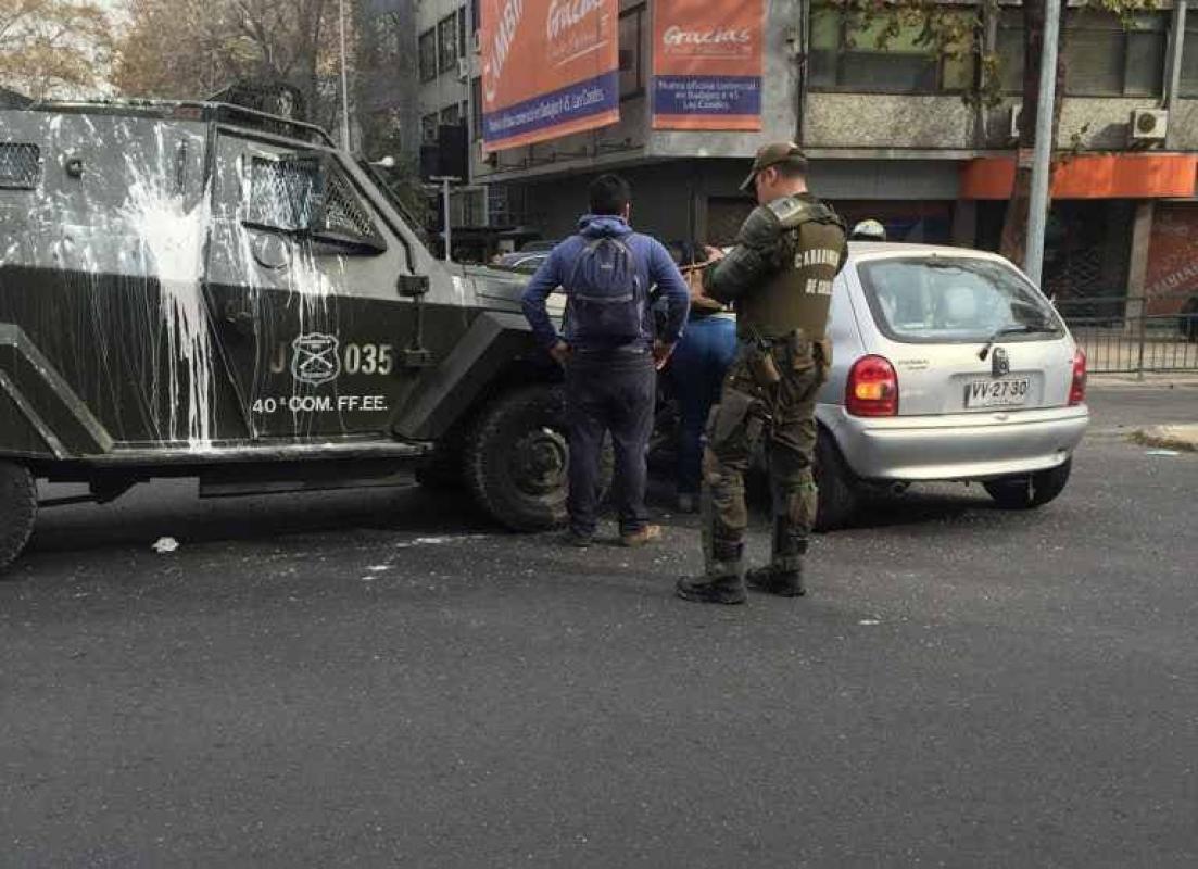 Un carro lanzagases de Carabineros impactó este jueves a un vehícuo particular que transitaba por el centro de Santiago.