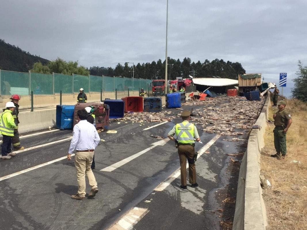 Cientos de jibias en carretera de Lota tras accidente de tránsito