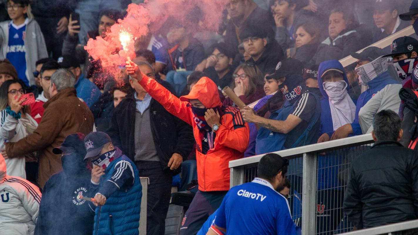 Fue durante el encuentro entre Universidad de Chile y Universidad Católica donde se registró el lanzamiento de bombas de ruido y bengalas, lo que obligó a la suspensión del denominado “clásico universitario”.