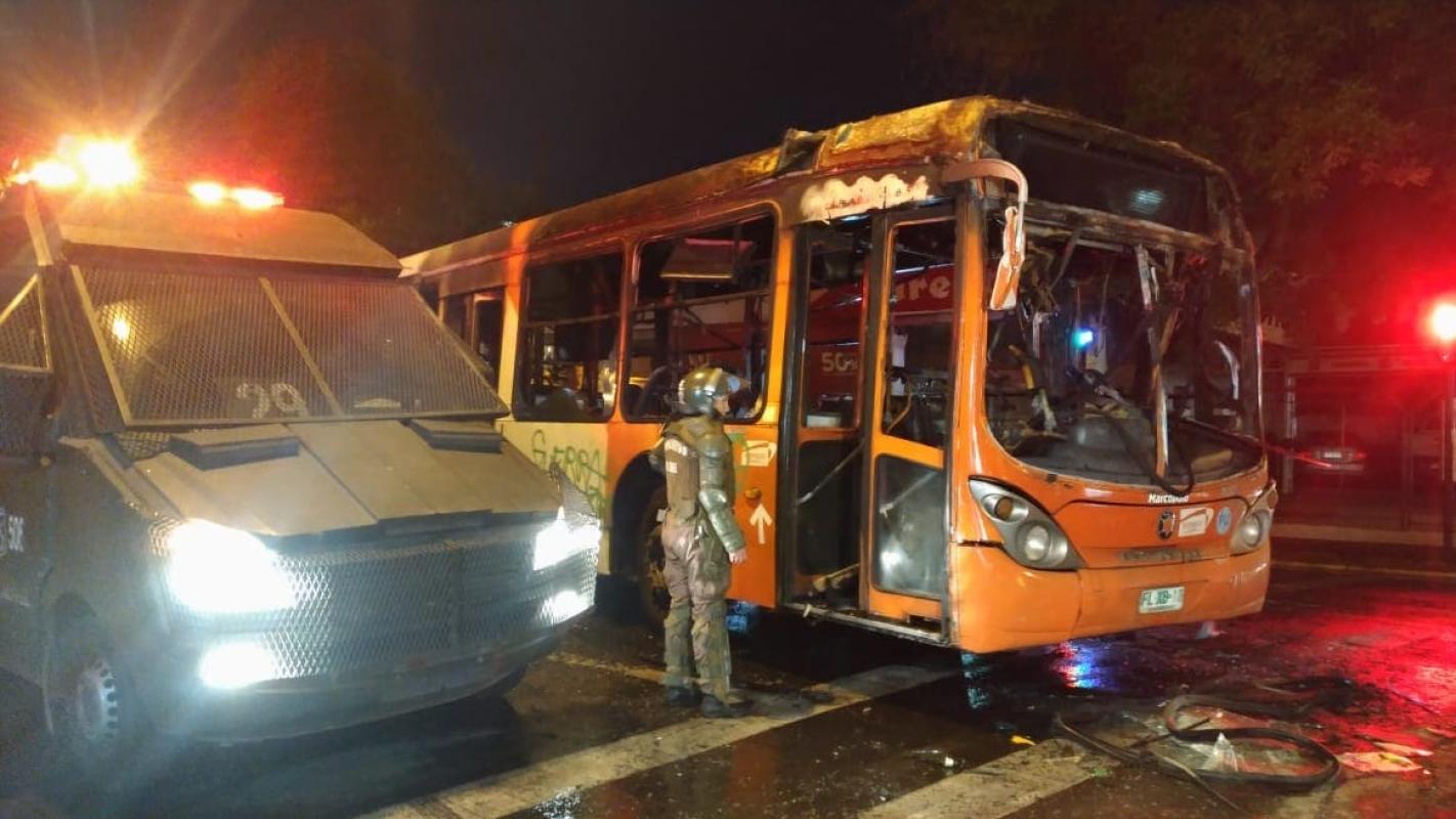 Un grupo de desconocidos quemó un bus del Transantiago en cercanías al Parque Bustamante durante la noche de este martes.