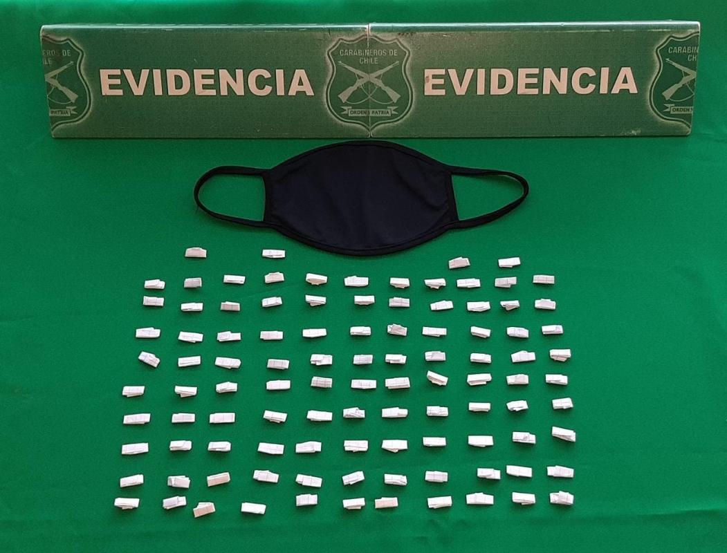 Fue ahí cuando se percataron que el hombre poseía una mascarilla abultada, la cual, al ser inspeccionada, poseía 103 envoltorios de papel cuadriculados con pasta base de cocaína.