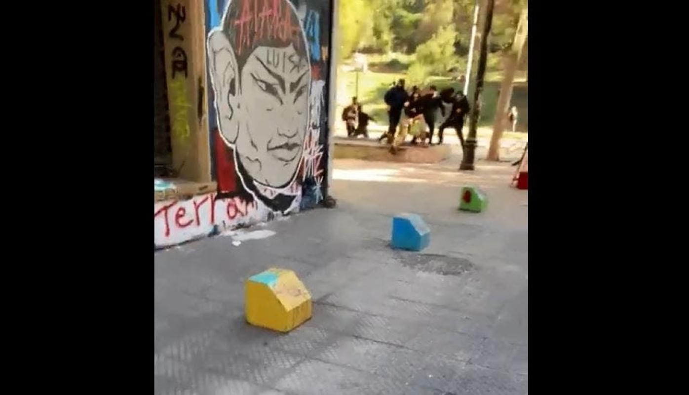 El registro fue compartido por el diputado Jorge Alessandri (UDI) y en este se ve cómo el uniformado es golpeado por un grupo encapuchados. Luego se escucha el disparo que realiza con su arma de servicio.