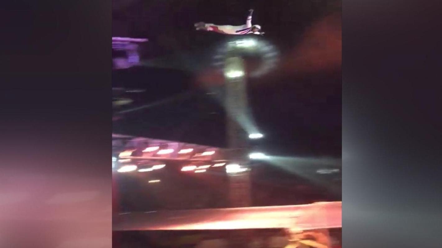 El acróbata salió disparado del cañón más allá de lo planeado y terminó cayendo encima de un payaso del espectáculo, quien no resultó con lesiones.