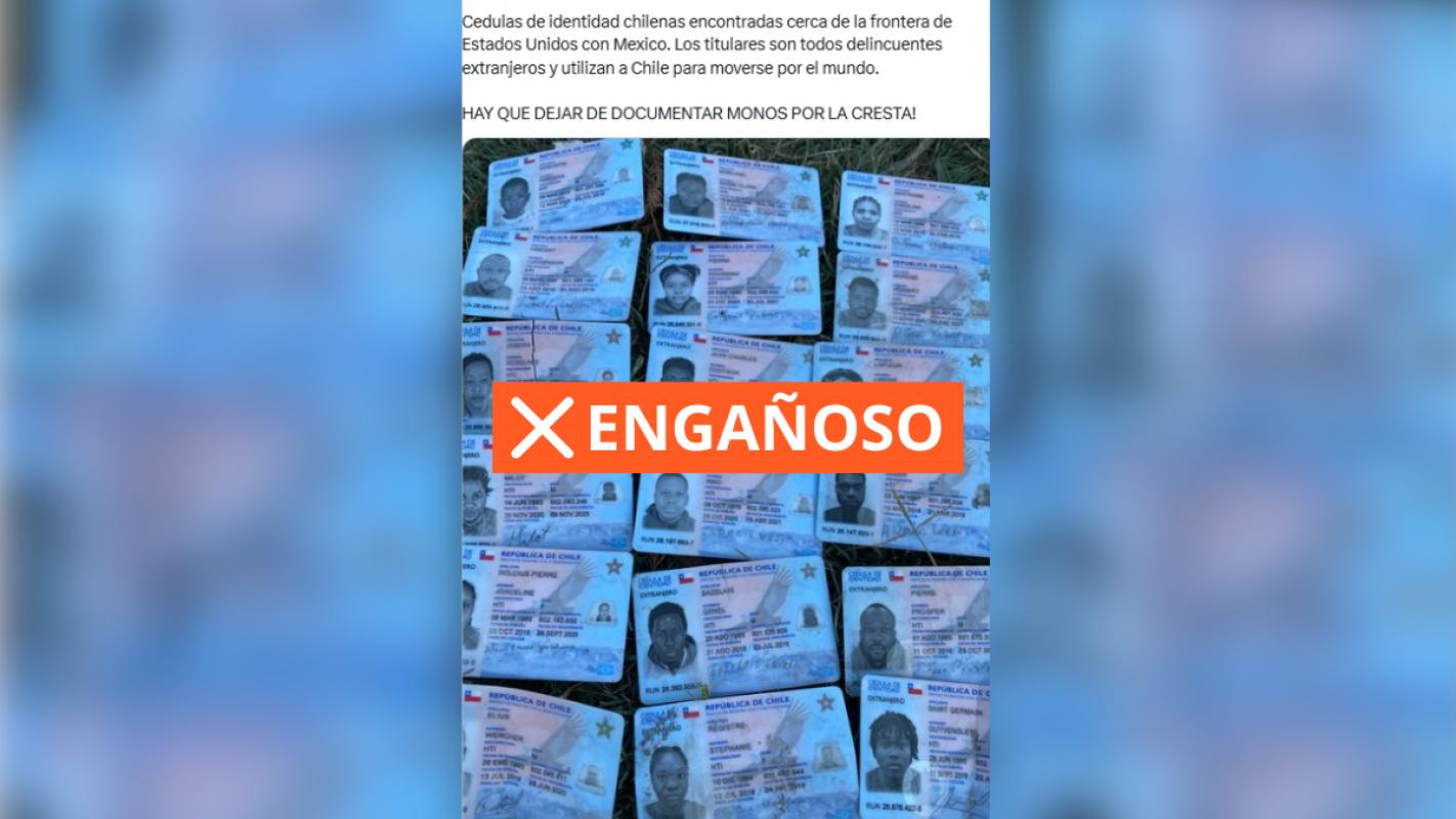 A través de redes sociales aseguran que cédulas de identidad chilenas otorgadas a ciudadanos extranjeros (haitianos), habrían sido encontradas cerca de la frontera de México con Estados Unidos. En la publicación afirman que esas personas son "delincuentes" que utilizan a Chile para "moverse por el mundo".