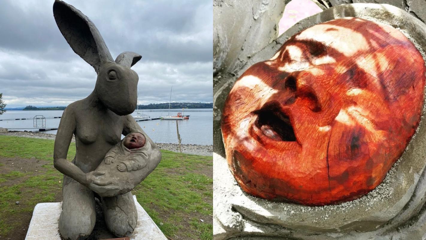Una escultura que está siendo instalada en Puerto Varas generó un debate en redes sociales por su particular forma: Es un conejo antropomórfico con un bebé en brazos.