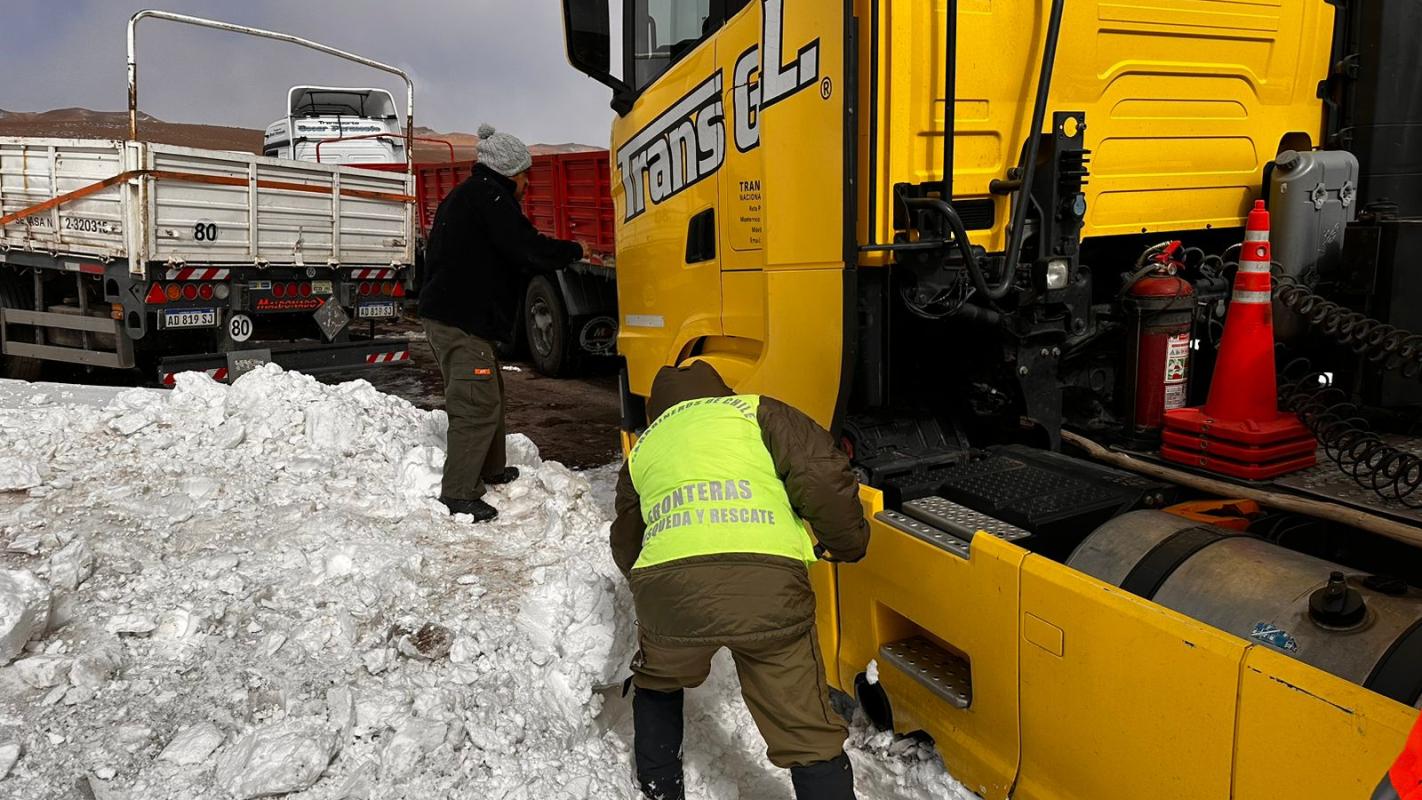 Este sábado Carabineros de la Segunda Comisaría de San Pedro de Atacama prestaron auxilio y evacuaron a los conductores de camiones de carga internacional luego de que se encontraran con viento blanco, nieve y hielo en la Ruta 27 CH, camino que une San Pedro de Atacama con Argentina.