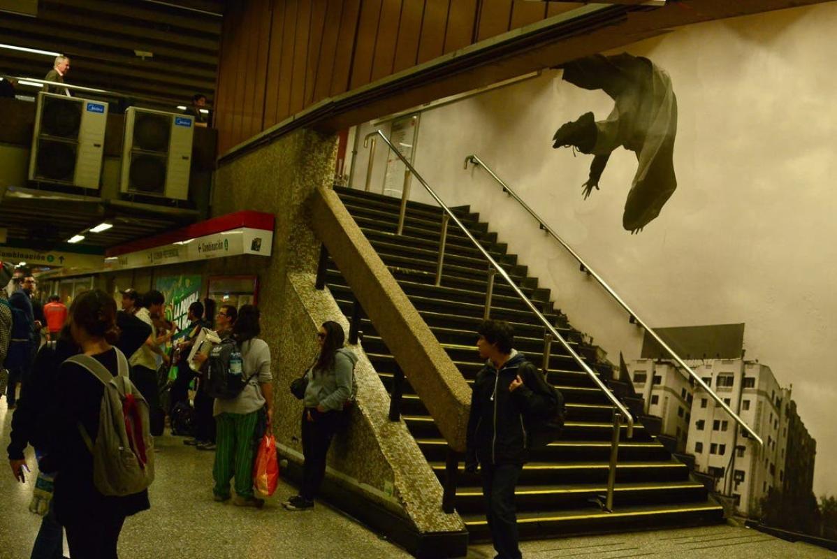 Se trata de "Agora", obra del fotógrafo Javier Godoy y que ocupa 400 metros cuadrados de la estación, y que está instalado cerca de las escaleras de acceso al andén.