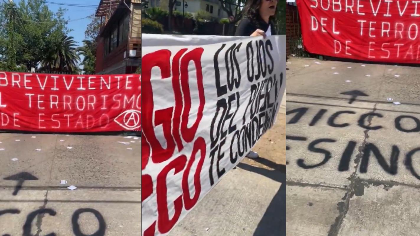 A través de un video difundido en redes sociales, se puede ver a un grupo de personas que instalaron un lienzo en el portón del domicilio de Sergio Micco, el cual decía: “Sobrevivientes del terrorismo de Estado”, además, pintaron en el suelo “Micco asesino”.