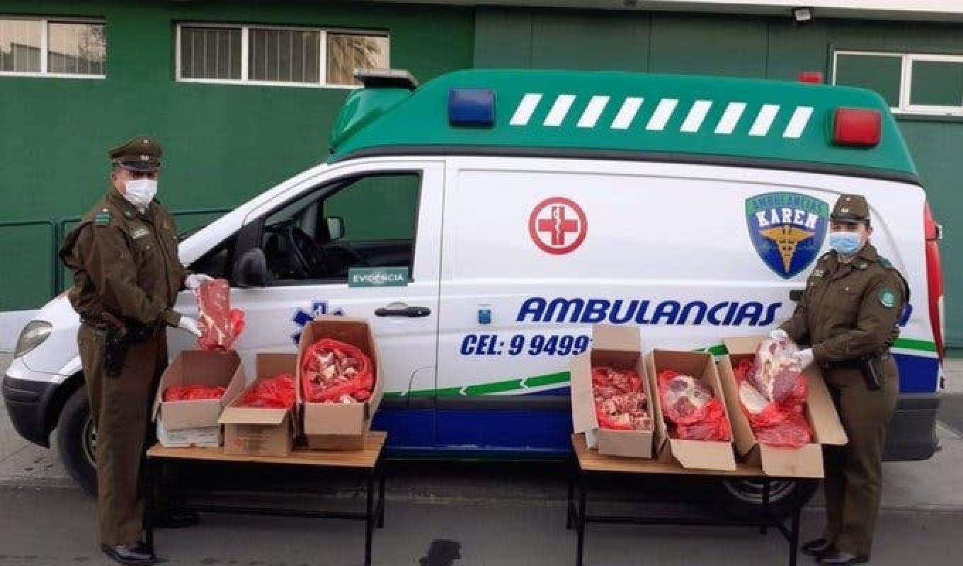 Según lo constatado por Carabineros, ambos sujetos trasladaban cerca de 160 kilos de carne en una ambulancia para evadir los controles policiales y evitar levantar sospechas sobre la carga que llevaban.