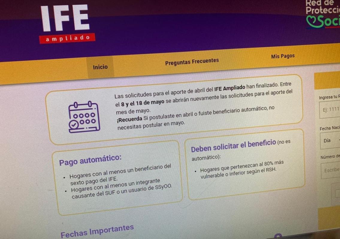 Según consigna el sitio web del Ingreso Familiar de Emergencia (IFE), las solicitudes para este mes inician este sábado 8 de mayo.