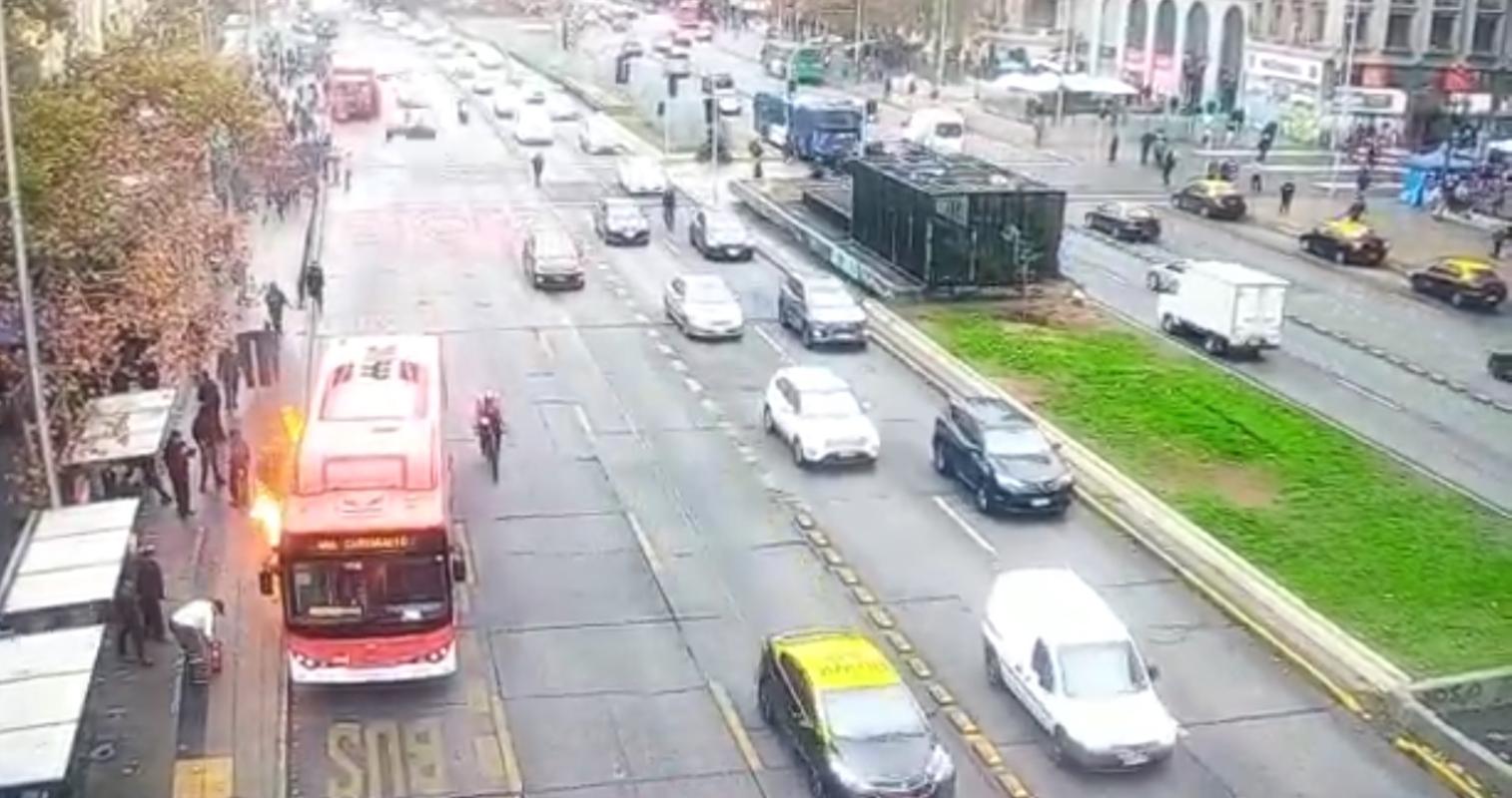 Como parte de los mismos incidentes en las inmediaciones del establecimiento, se generó un amago de incendio cuando un grupo de sujetos intentó quemar un bus de la locomoción colectiva en plena Alameda, hecho que fue captado por las cámaras de seguridad.