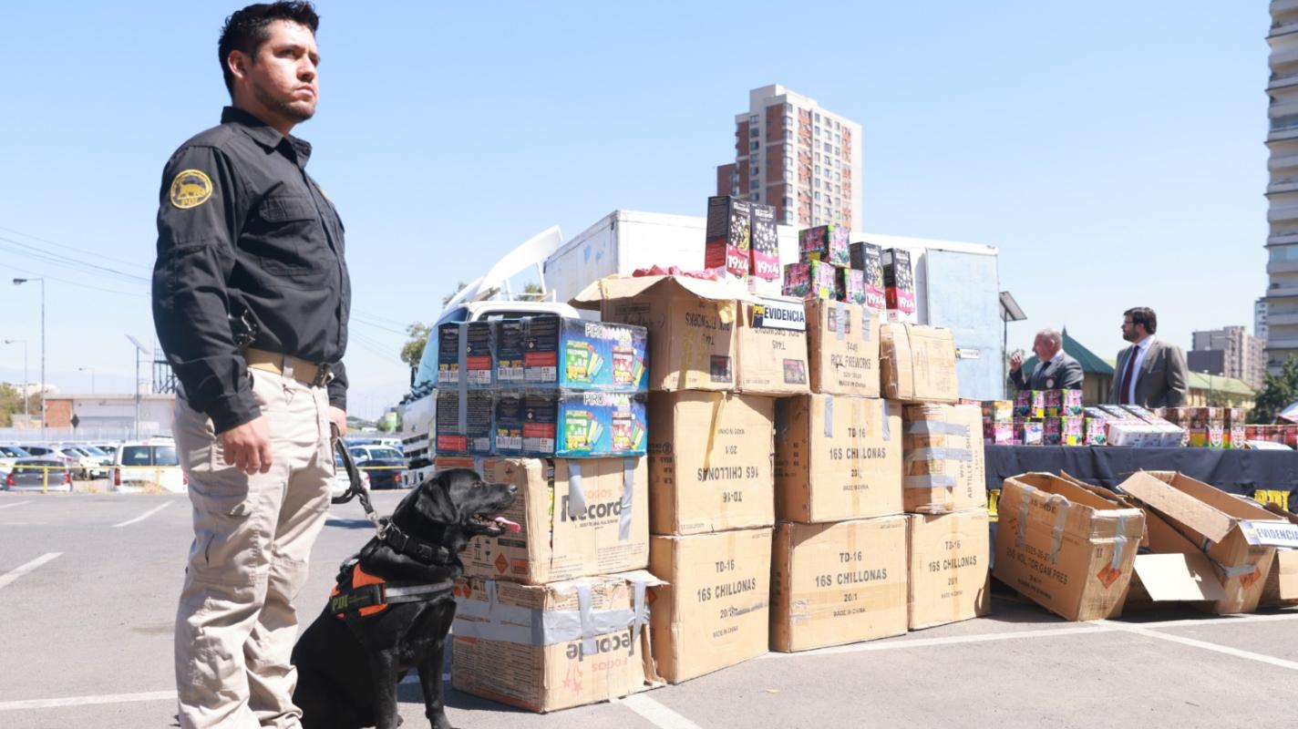 En el marco de una investigación de la Brigada Contra el Crimen Organizado (Brico) de la Policía de Investigaciones (PDI), en donde se incautaron casi 1,5 toneladas en fuegos artificiales, “Javito”, uno de los ejemplares de la Brigada de Adiestramiento Canino (Briacan) emitió una alerta para positivo al momento de detectar elementos, en este caso, pirotécnicos.