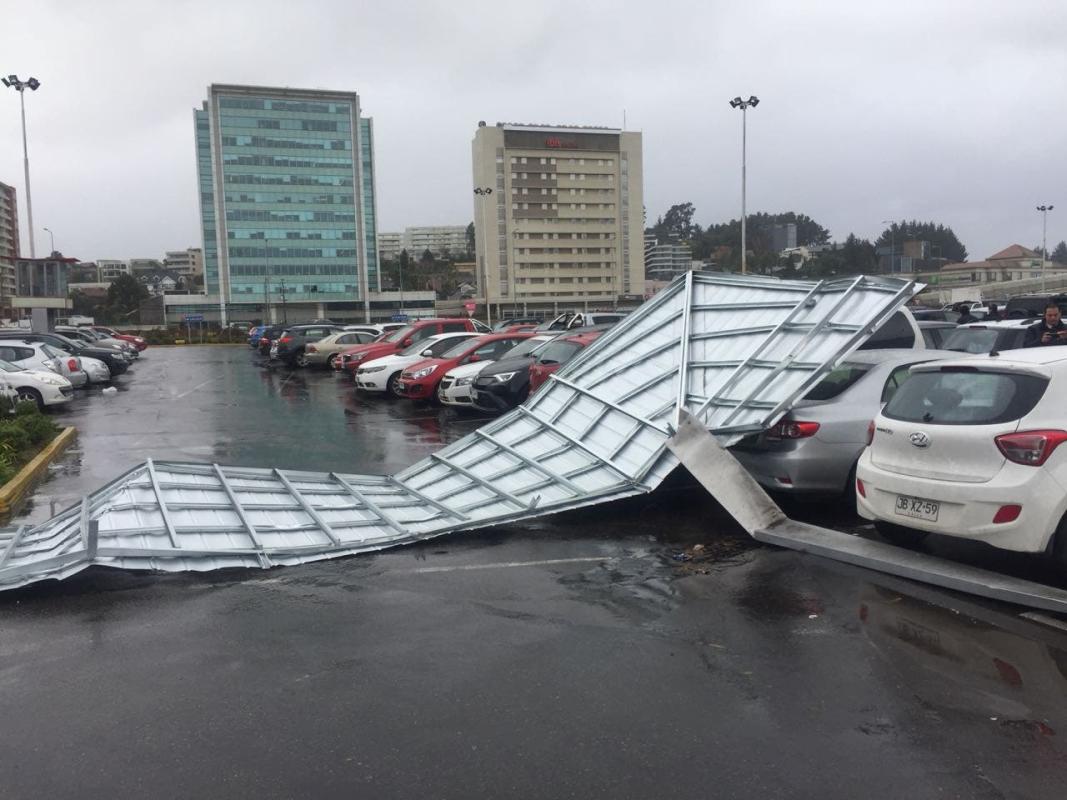Al colapso en la mañana de varias calles en la ciudad de Concepción y el desrielo de un tren de carga de Ferrocarriles del Sur en el tramo Quilacoya-Hualqui, se sumó durante la tarde la voladura de una estructura metálica en la comuna de Talcahuano, donde los vientos han alcanzado los 113 kilómetros por hora, y que cayeron sobre autos en el estacionamente en el Mall Plaza del Trébol.