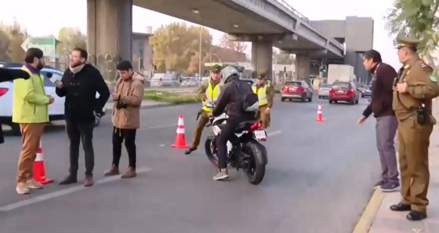 Pasadas las 09:00 horas las cámaras de Canal 13 registraron el intento de escape de un motorista a una fiscalización realizada por personal de Carabineros en la comuna de San Joaquín, región Metropolitana.
