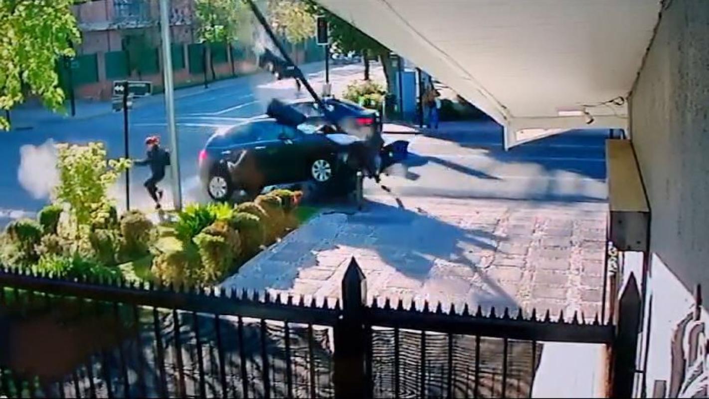 Además, en el breve registro se puede ver cómo el vehículo botó un semáforo que se encontraba en el sector, cayendo muy cerca de donde arrancó la joven que se encontraba caminando.