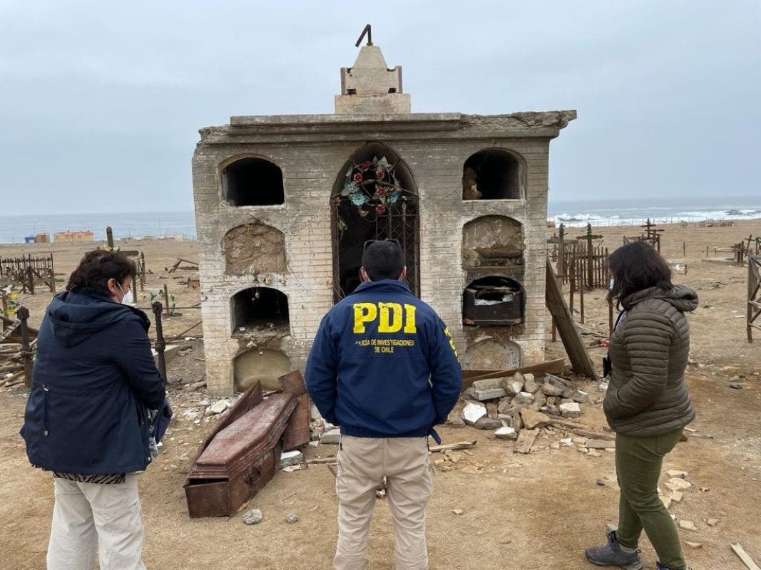Personal de la Brigada Investigadora de Delitos contra el Medio Ambiente y Patrimonio Cultural de la Policía de Investigaciones (PDI) realiza una serie de diligencias para dar con los responsables de diversos daños al interior del cementerio Gatico en la comuna de Tocopilla.