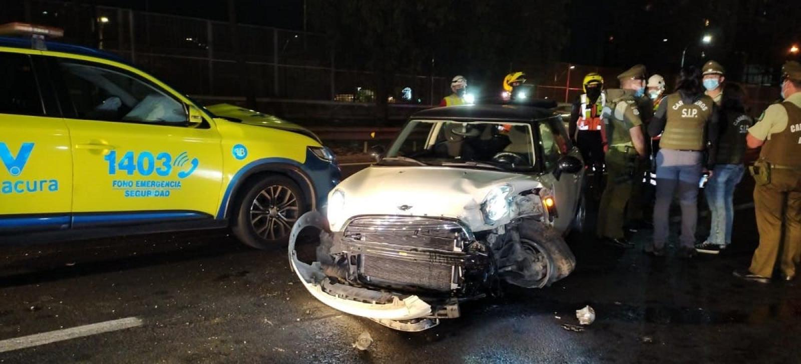 Bajaron por la Autopista Vespucio Norte y la Autopista Central, donde los ladrones colisionaron el vehículo sustraído contra uno de Seguridad Ciudadana a la altura de la Universidad Bernardo O'Higgins.
