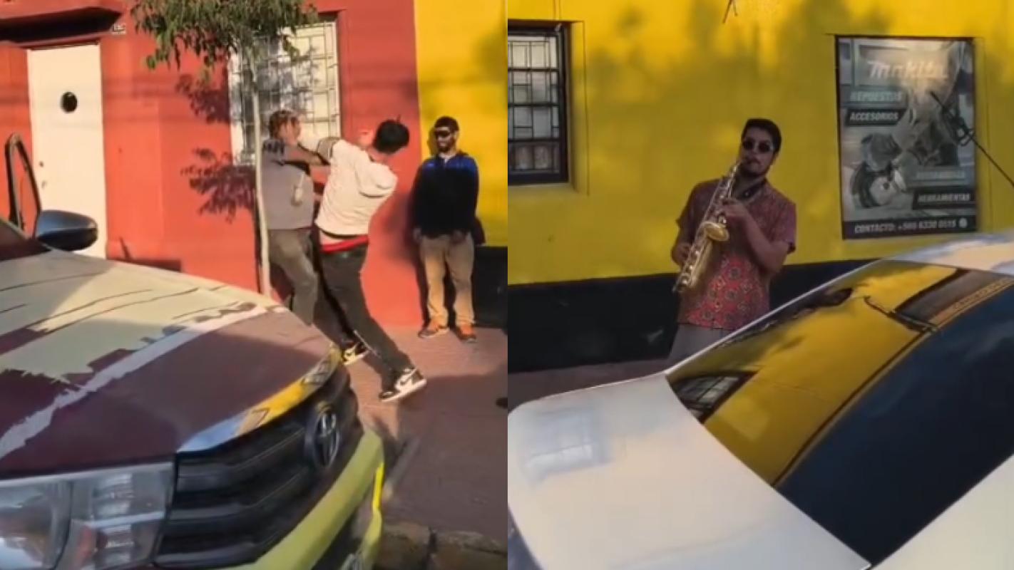 Un joven que se encontraba tocando el saxofón en el semáforo de la mencionada esquina también presenció el conflicto y aquí viene lo anecdótico: musicalizó la pelea.