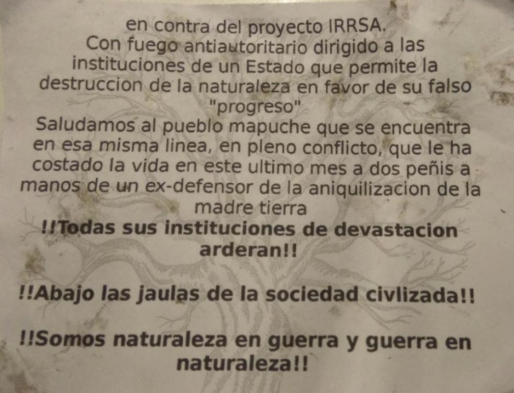 Los antisociales dejaron panfletos alusivos al rechazo del "Proyecto IIRSA". "Con fuego antiautoritario dirigidos a las instituciones de un Estado que permite la destrucción de la naturaleza en favor de su falso 'progreso'", rezan los papeles encontrados en la comuna de Estación Central.