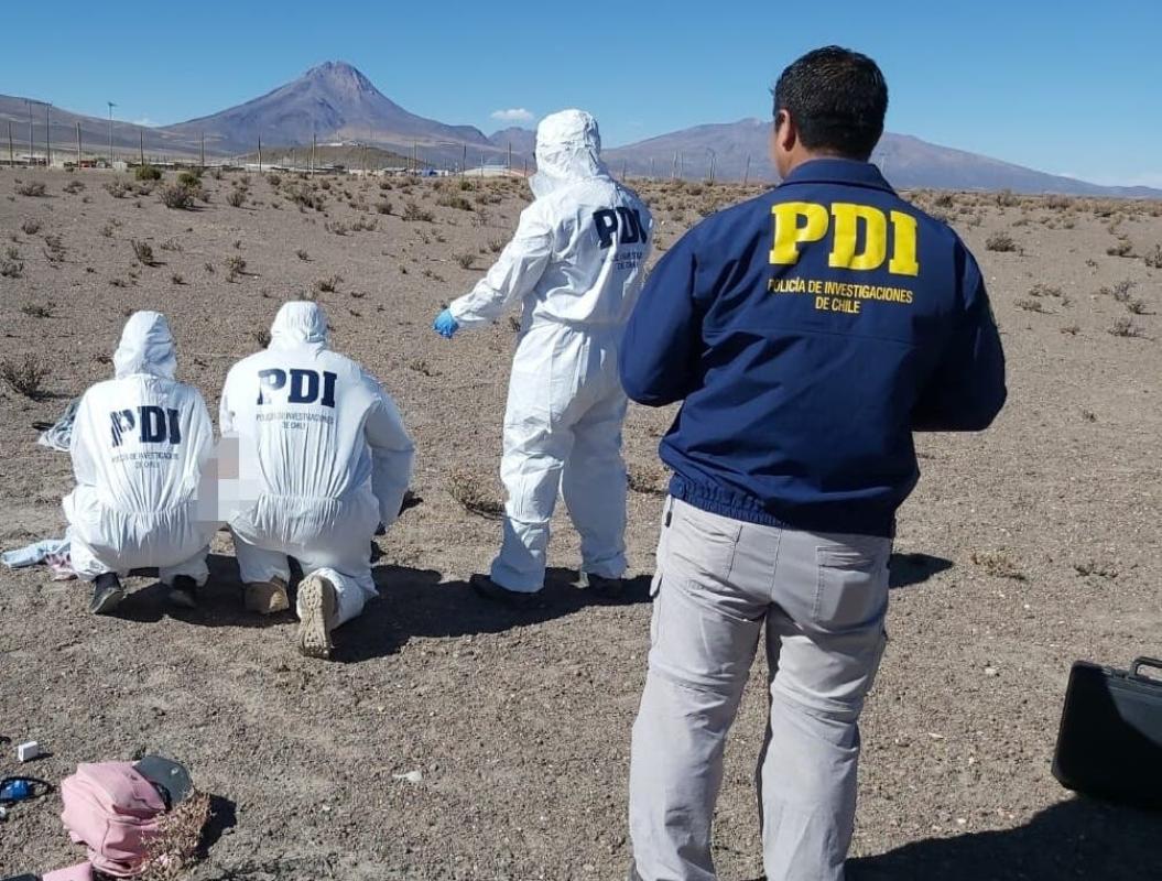 Personal de la Brigada de Homicidios de la Policía de Investigaciones (PDI) junto a la Fiscalía Local de Pozo al Monte indagan el hallazgo del cuerpo de un mujer en el sector fronterizo de la comuna de Colchane en la región de Tarapacá.