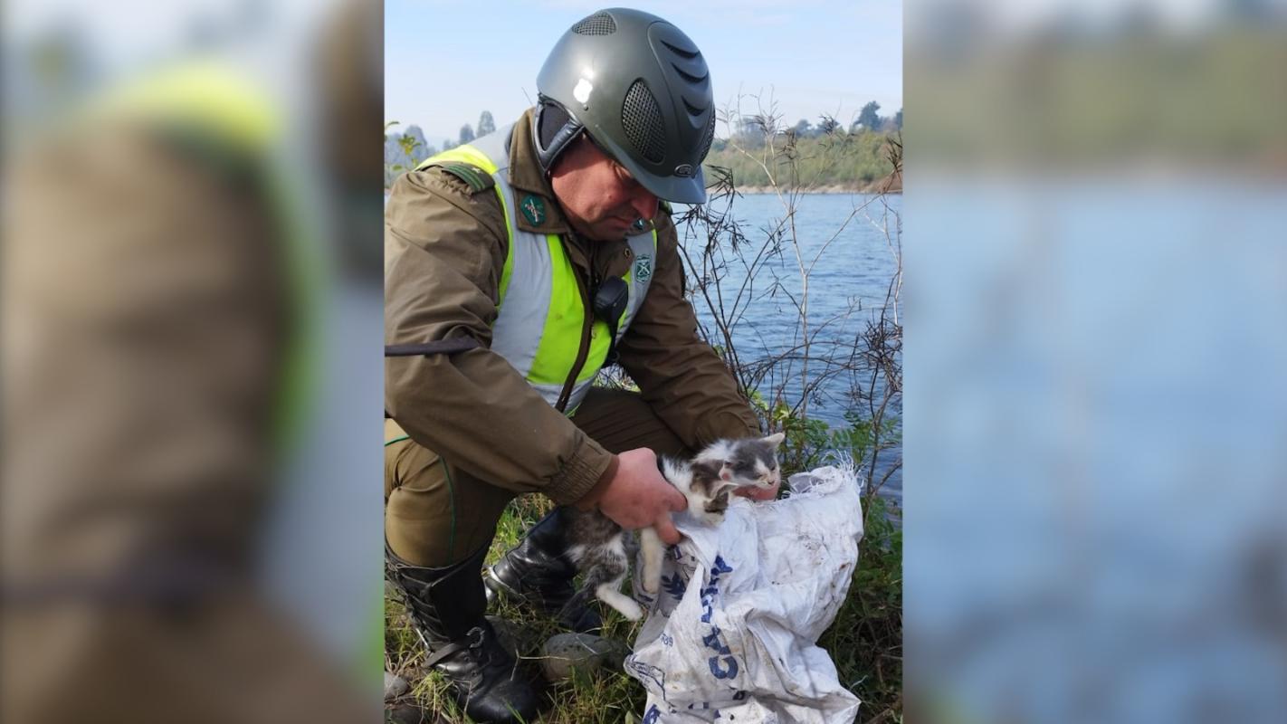 Carabineros rescatan dos gatitos abandonados en un saco a orillas del río Cautín en Temuco