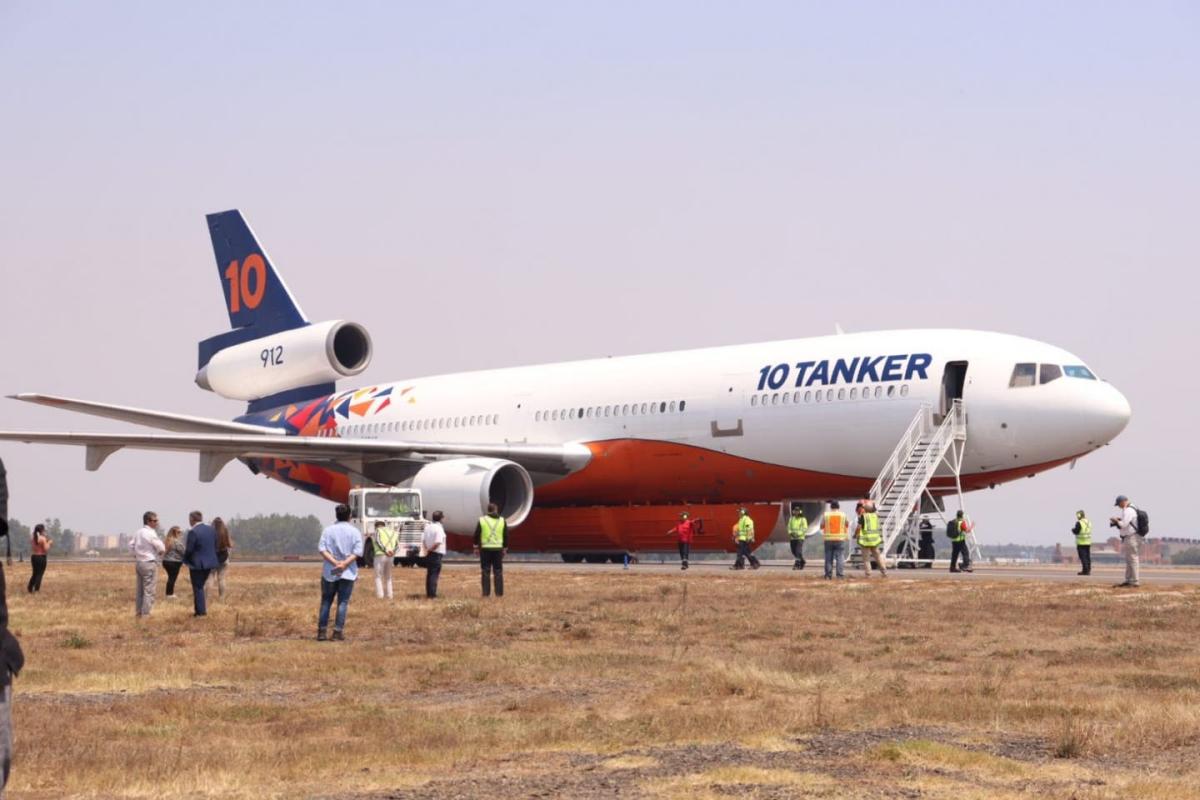 El avión estadounidense DC-10 Air Tanker, conocido como 'Ten Tanker', aterrizó la tarde de este lunes en el Aeropuerto Carriel Sur de Talcahuano.