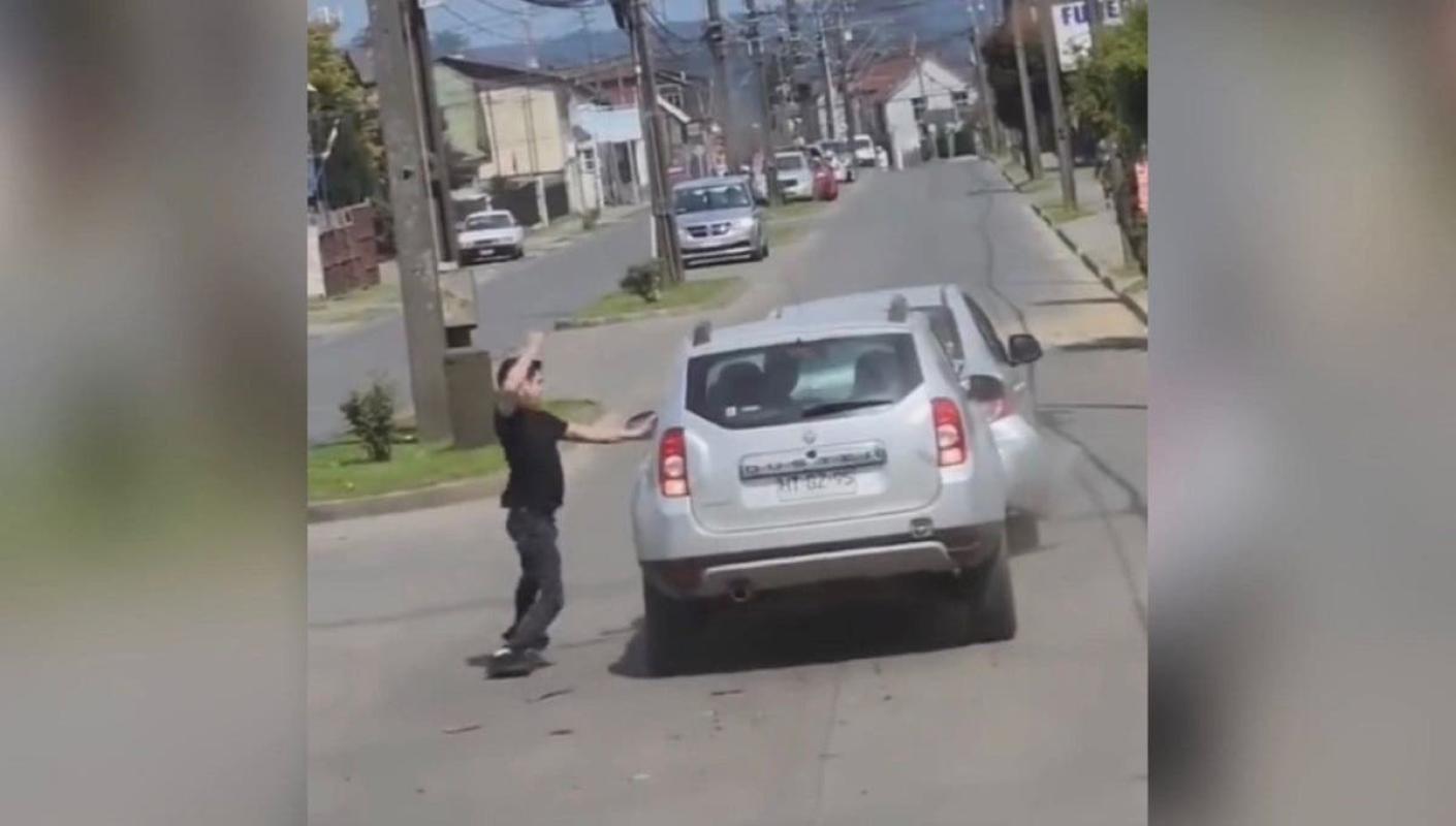Y continuó: "Luego avancé para dar la vuelta y regresar al centro, y cuando iba a la altura de la misma panadería, había un camión estacionado (cuyo conductor grabó la agresión), señalicé para sobrepasarlo y atrás venía el Duster a exceso de velocidad. Lo vi tan encima que me asusté y se me detuvo el auto, entonces él me clavó la bocina y me dice 'fíjate poh hijo de puta', por lo que yo bajé el vidrio y le dije que tenga más cuidado".