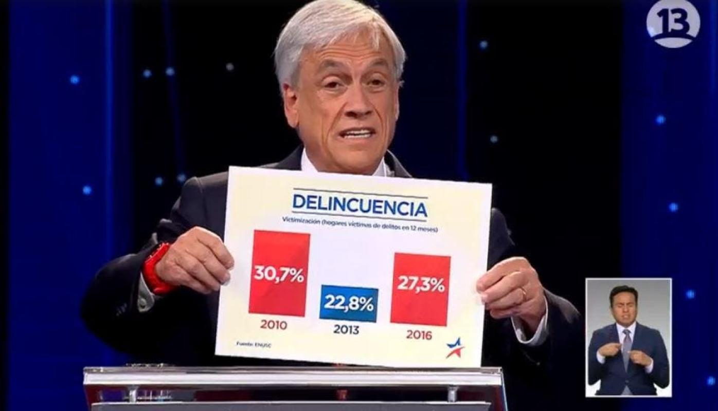 Sin embargo, Piñera no se detuvo ahí. Aprovechando su tiempo disponible, el ex mandatario mostró un gráfico con el título "delincuencia" para demostrar de qué manera ésta había caído durante su gobierno.