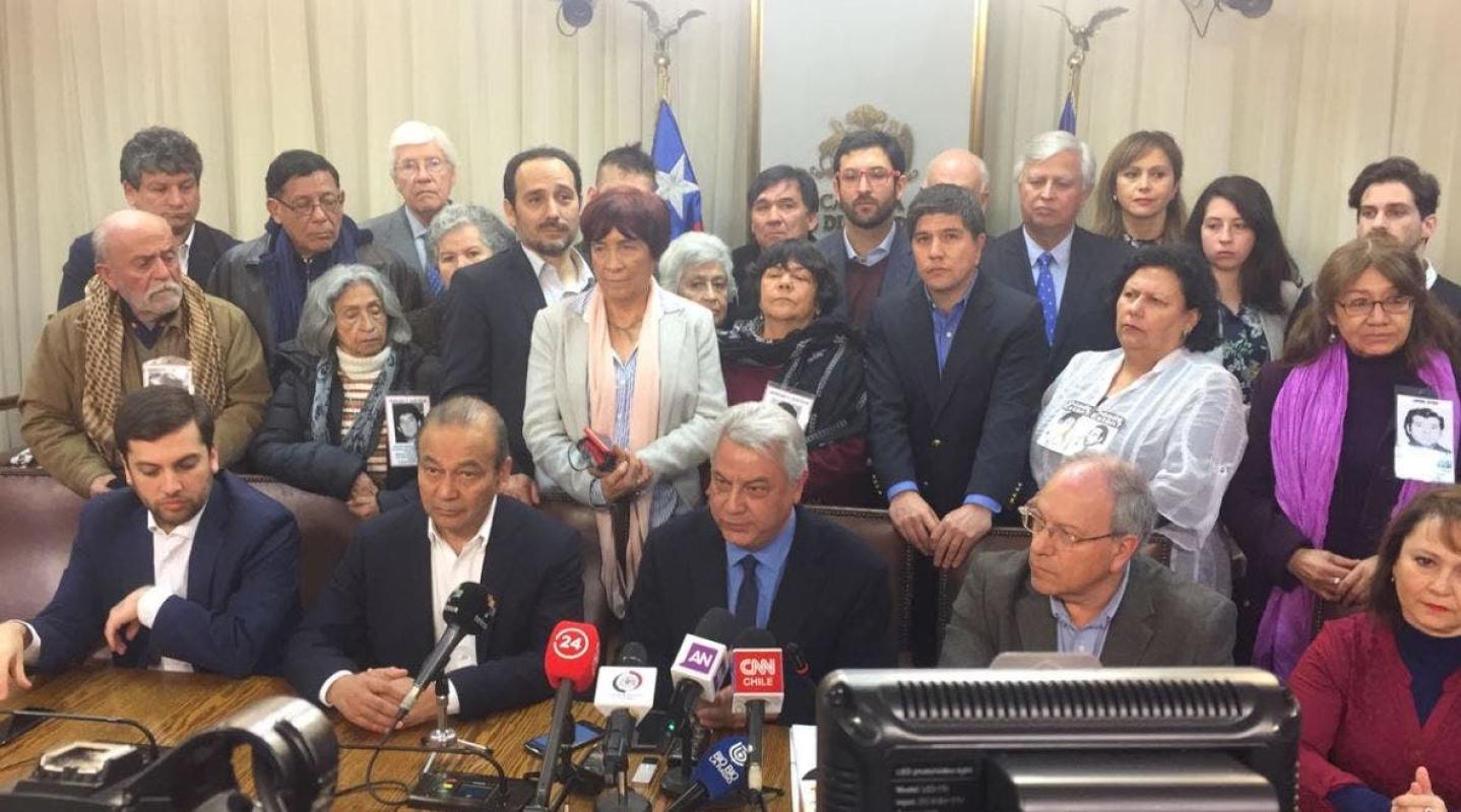 En tanto, en la sala de la Cámara de Diputados las bancadas de oposición se manifestaron al respecto con fotografías de detenidos desaparecidos en sus puestos de trabajo y un letrero que señalaba que "la acusación va".