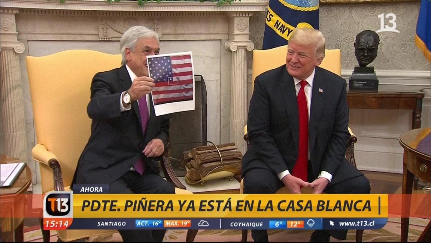 En pleno salón oval y frente a los medios de comunicación, Piñera mostró una imagen impresa de la bandera chilena justo en el centro de la bandera de los Estados Unidos, situación que fue tomada con humor por el mandatario norteamericano.