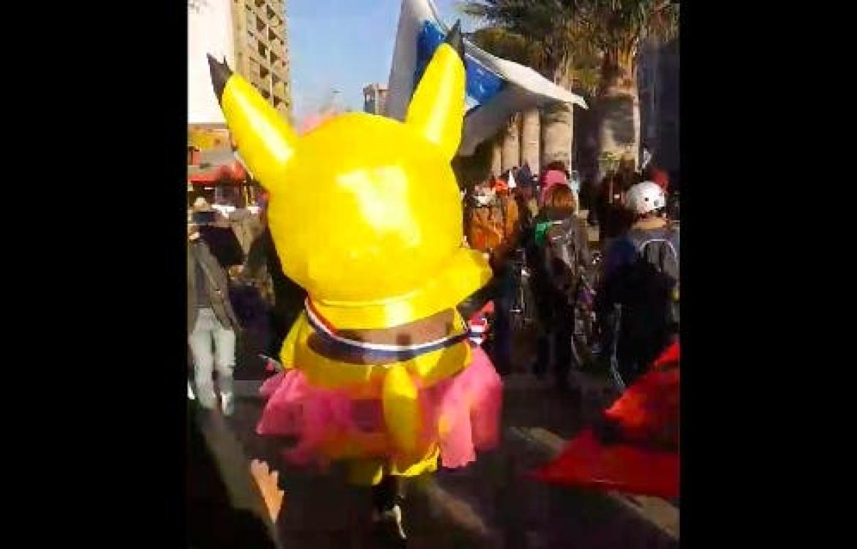 La "Tía Pikachu" fue acompañada por varias personas en una colorida marcha con otros disfraces inflables.