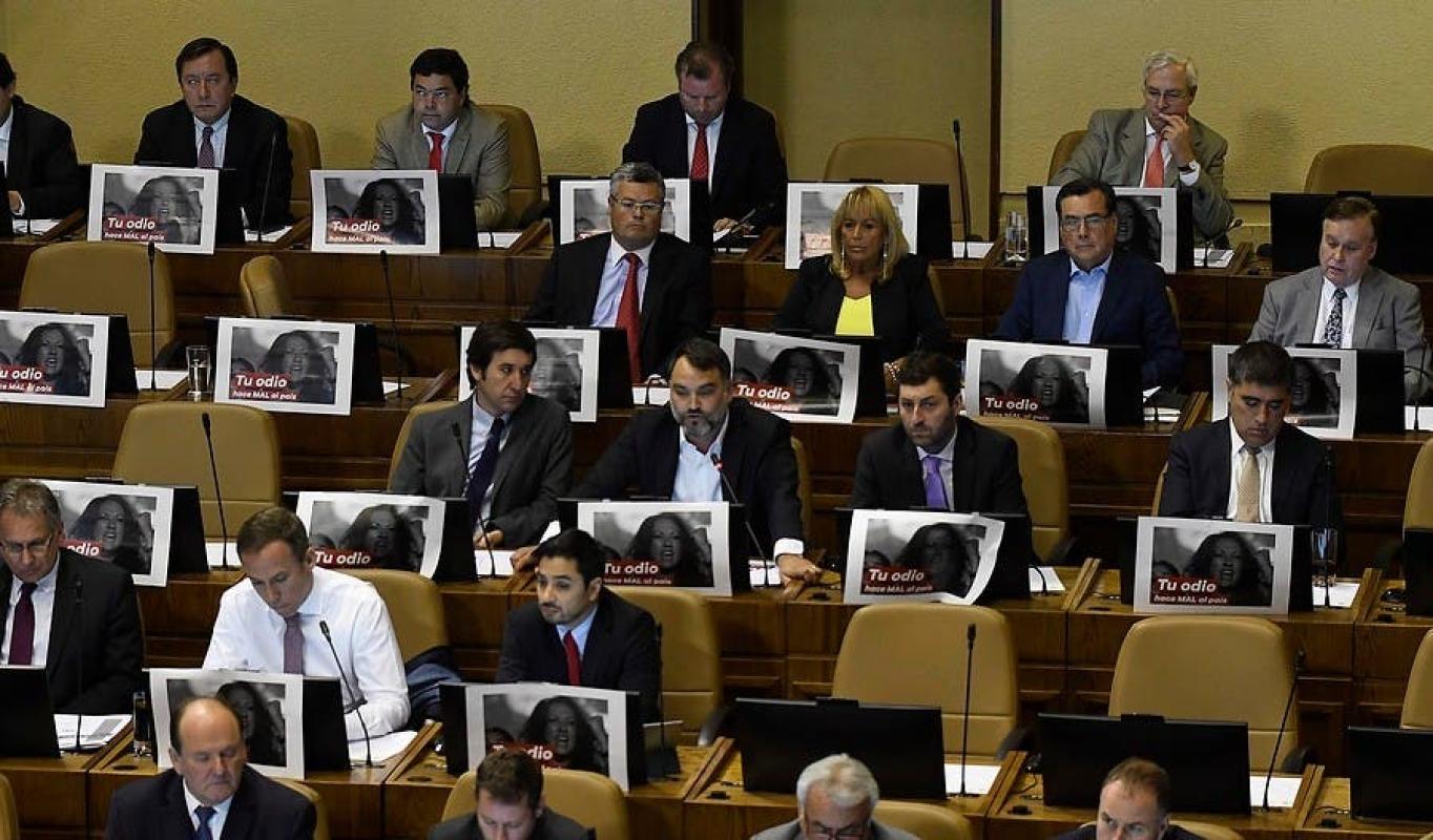 Con pancartas en la sala, la bancada de la Unión Demócrata Independiente (UDI) protestó en contra de la diputada Marisela Santibáñez por sus dichos sobre la muerte del abogado y fundador de la UDI, Jaime Guzmán.
