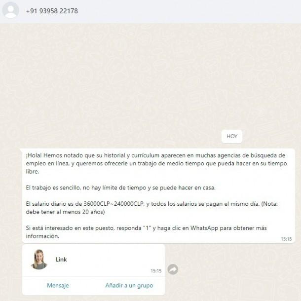 Todos sabemos lo importante que es conseguir un trabajo y, obviamente, los ciberdelincuentes también, así que toman esta oportunidad para estafar a través de WhatsApp a gente que se encuentra haciendo esa búsqueda. Hablan desde un número desconocido ofreciendo un sueldo diario de hasta $240.000, algo muy llamativo.