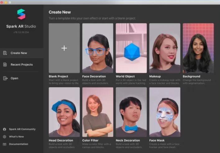 Los efectos se crean como proyectos. Cuando abras la app verás la ventana de “Create New” con sugerencias. La mayoría de filtros y efectos que permite crear la aplicación, aprovechan la realidad aumentada: maquillaje, fondos personalizados, máscaras decorativas, etcétera. Aunque también verás filtros de color para crear tú mismo al estilo del Instagram más clásico.