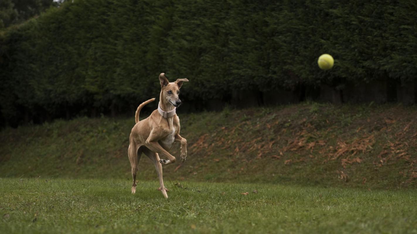 Perro galgo jugando con una pelota